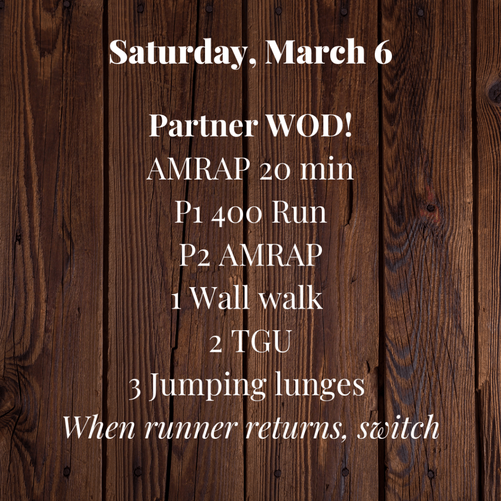 Saturday, March 6 Posted bySteph VermeychukMarch 6, 2021March 3, 2021Posted inWorkout of the Day Partner WOD Saturday!!! Share this: Click to share on X (Opens in new window) X Click to share on Facebook (Opens in new window) Facebook Like Loading... Related