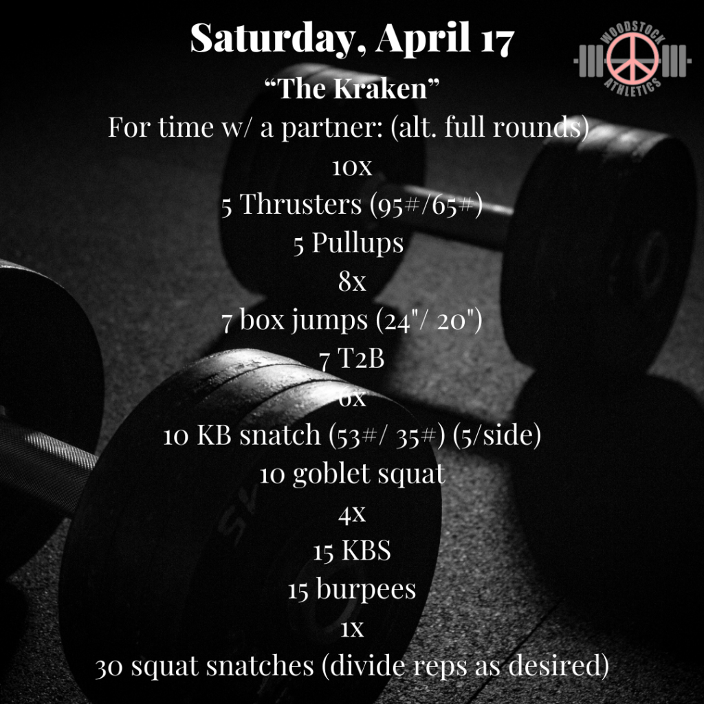 WOD: Saturday, April 17 Posted bySteph VermeychukApril 17, 2021April 12, 2021Posted inWorkout of the Day Release The Kraken!!! Share this: Click to share on X (Opens in new window) X Click to share on Facebook (Opens in new window) Facebook Like Loading... Related