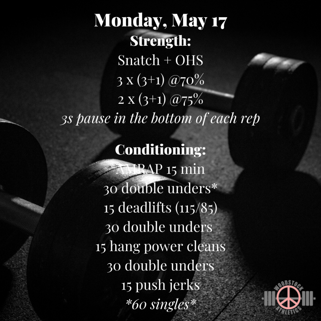WOD: Monday, May 17 Posted bySteph VermeychukMay 17, 2021May 17, 2021Posted inWorkout of the Day Today is going to be a great day! Share this: Click to share on X (Opens in new window) X Click to share on Facebook (Opens in new window) Facebook Like Loading... Related
