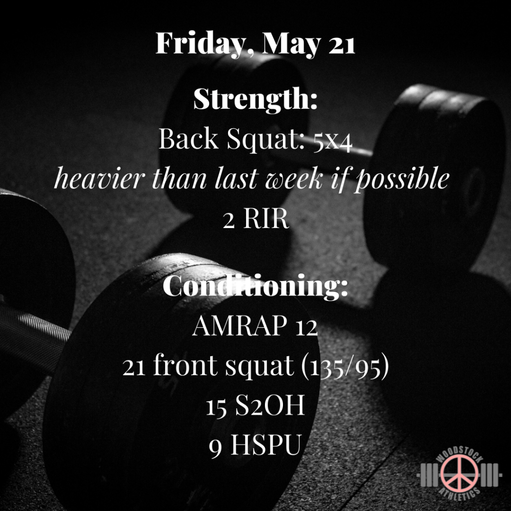 WOD: Friday, May 21 Posted bySteph VermeychukMay 21, 2021May 17, 2021Posted inWorkout of the Day What could be better than back squats on a Friday?!? Share this: Click to share on X (Opens in new window) X Click to share on Facebook (Opens in new window) Facebook Like Loading... Related