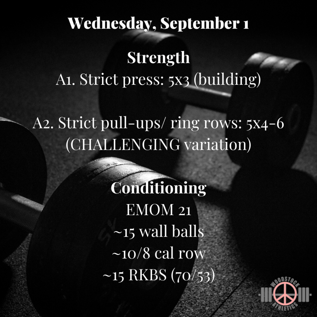 WOD: Wednesday, September 1 Posted bySteph VermeychukSeptember 1, 2021August 29, 2021Posted inWorkout of the Day How is it September already?!? Share this: Click to share on X (Opens in new window) X Click to share on Facebook (Opens in new window) Facebook Like Loading... Related