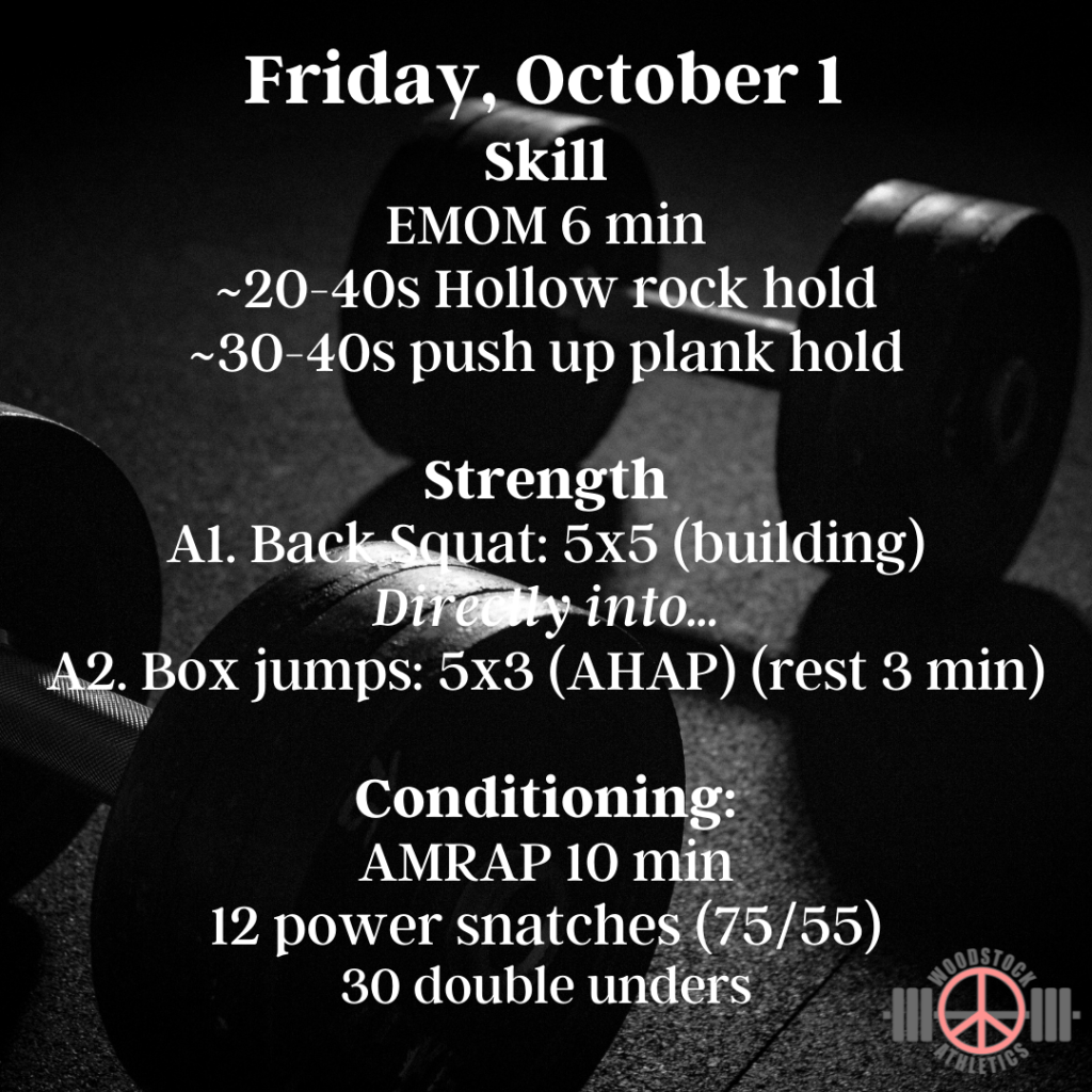 WOD: Friday, October 1 Posted bySteph VermeychukOctober 1, 2021September 26, 2021Posted inWorkout of the Day Happy Friday, team! Skills, Squats, and Snatches today! Share this: Click to share on X (Opens in new window) X Click to share on Facebook (Opens in new window) Facebook Like Loading... Related