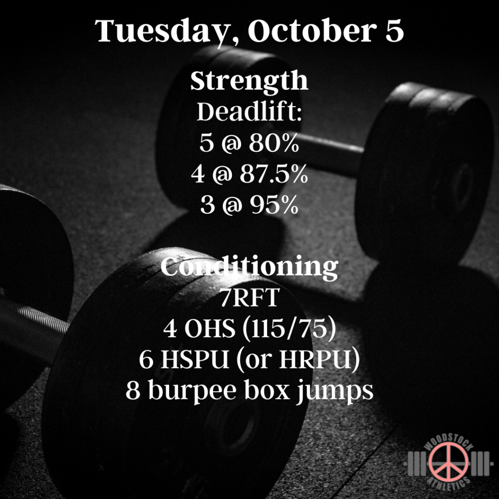 WOD: Tuesday, October 5 Posted bySteph VermeychukOctober 5, 2021October 3, 2021Posted inWorkout of the Day Deadlift day today! Share this: Click to share on X (Opens in new window) X Click to share on Facebook (Opens in new window) Facebook Like Loading... Related