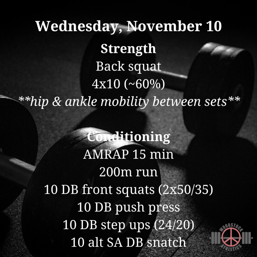 WOD: Wednesday, November 10 Posted bySteph VermeychukNovember 10, 2021November 8, 2021Posted inWorkout of the Day Some high volume back squats today. Share this: Click to share on X (Opens in new window) X Click to share on Facebook (Opens in new window) Facebook Like Loading... Related