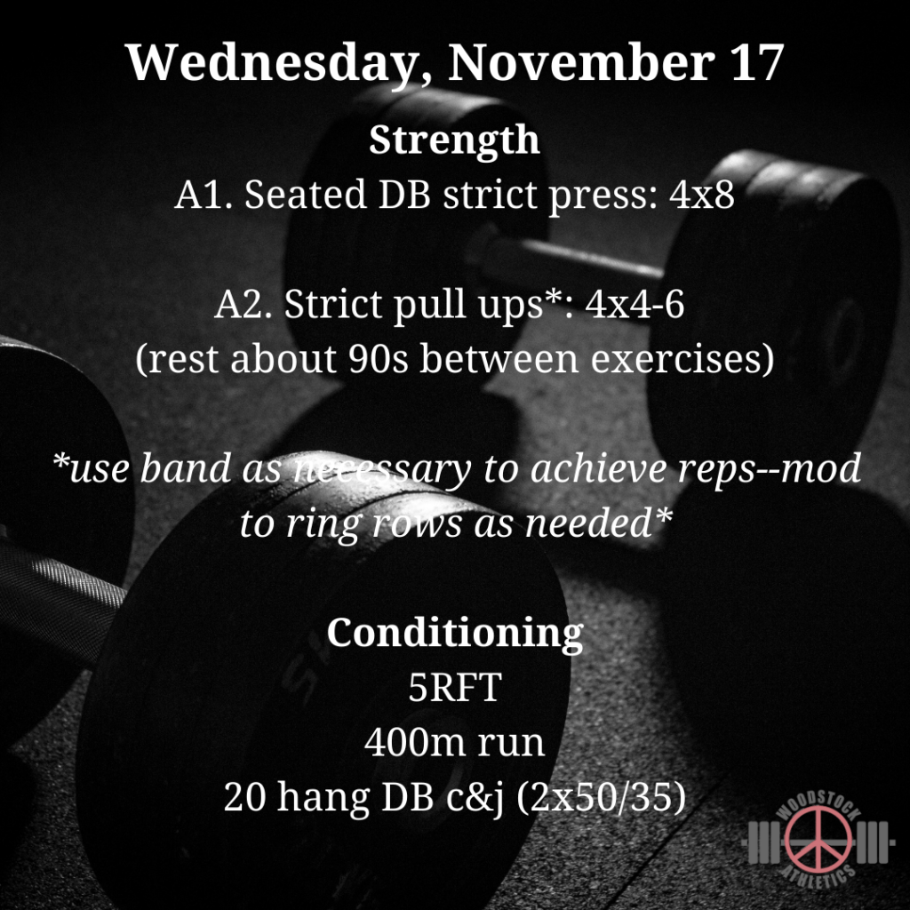 WOD: Wednesday, November 17 Posted bySteph VermeychukNovember 17, 2021November 14, 2021Posted inWorkout of the Day Upper body push/pull today. Share this: Click to share on X (Opens in new window) X Click to share on Facebook (Opens in new window) Facebook Like Loading... Related