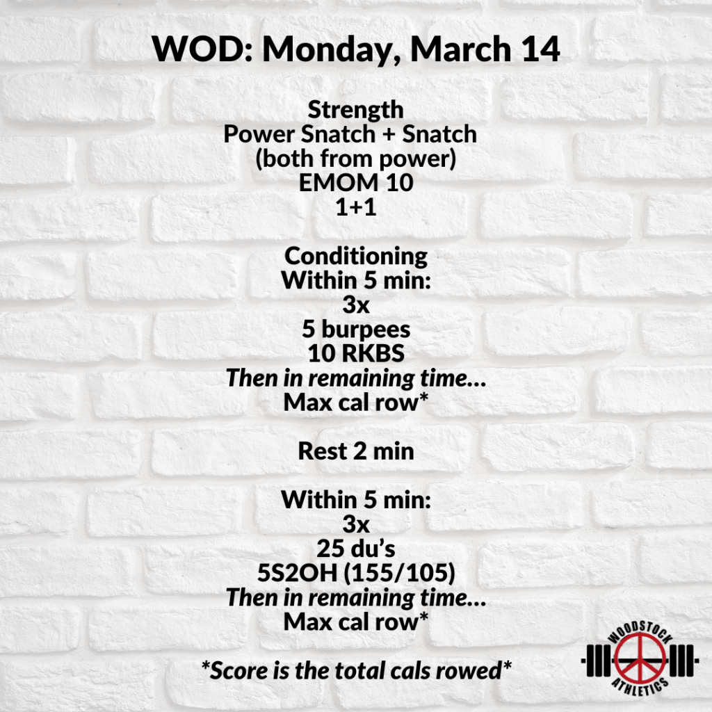 WOD: Monday, March 14 Posted bySteph VermeychukMarch 14, 2022March 13, 2022Posted inWorkout of the Day Share this: Click to share on X (Opens in new window) X Click to share on Facebook (Opens in new window) Facebook Like Loading... Related