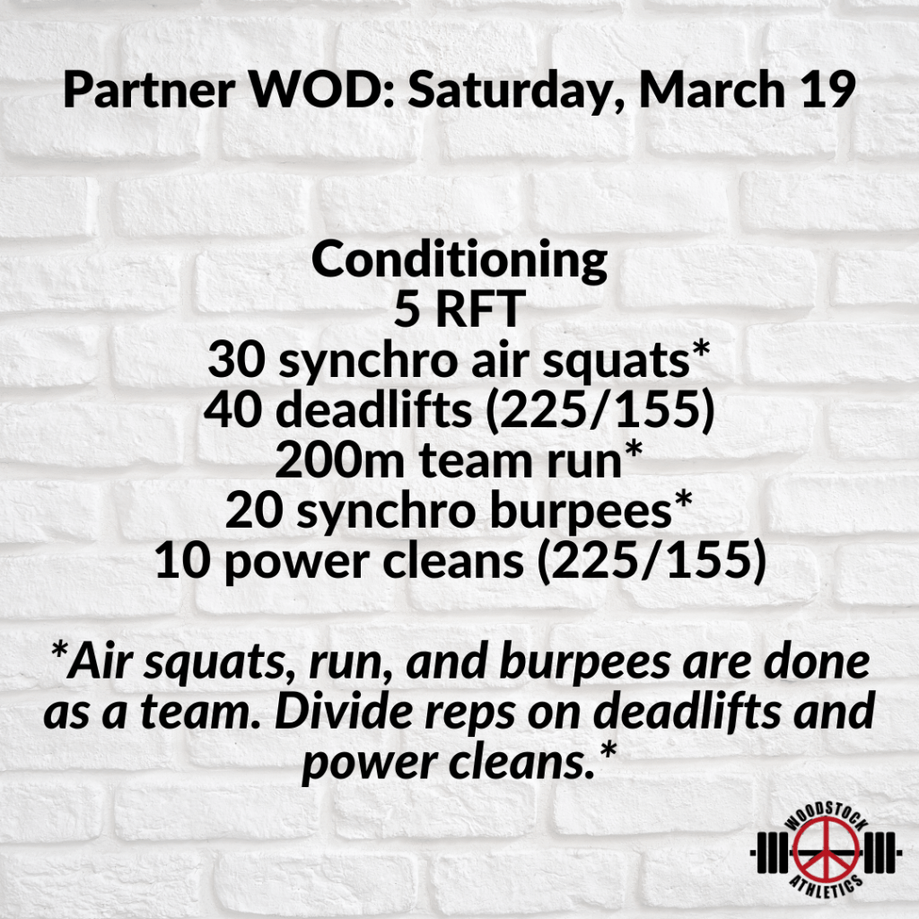 Partner WOD: Saturday, March 19 Posted bySteph VermeychukMarch 19, 2022March 13, 2022Posted inWorkout of the Day Share this: Click to share on X (Opens in new window) X Click to share on Facebook (Opens in new window) Facebook Like Loading... Related