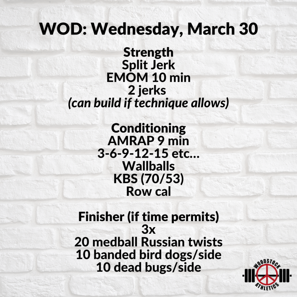 WOD: Wednesday, March 30 Posted bySteph VermeychukMarch 30, 2022March 27, 2022Posted inWorkout of the Day Share this: Click to share on X (Opens in new window) X Click to share on Facebook (Opens in new window) Facebook Like Loading... Related
