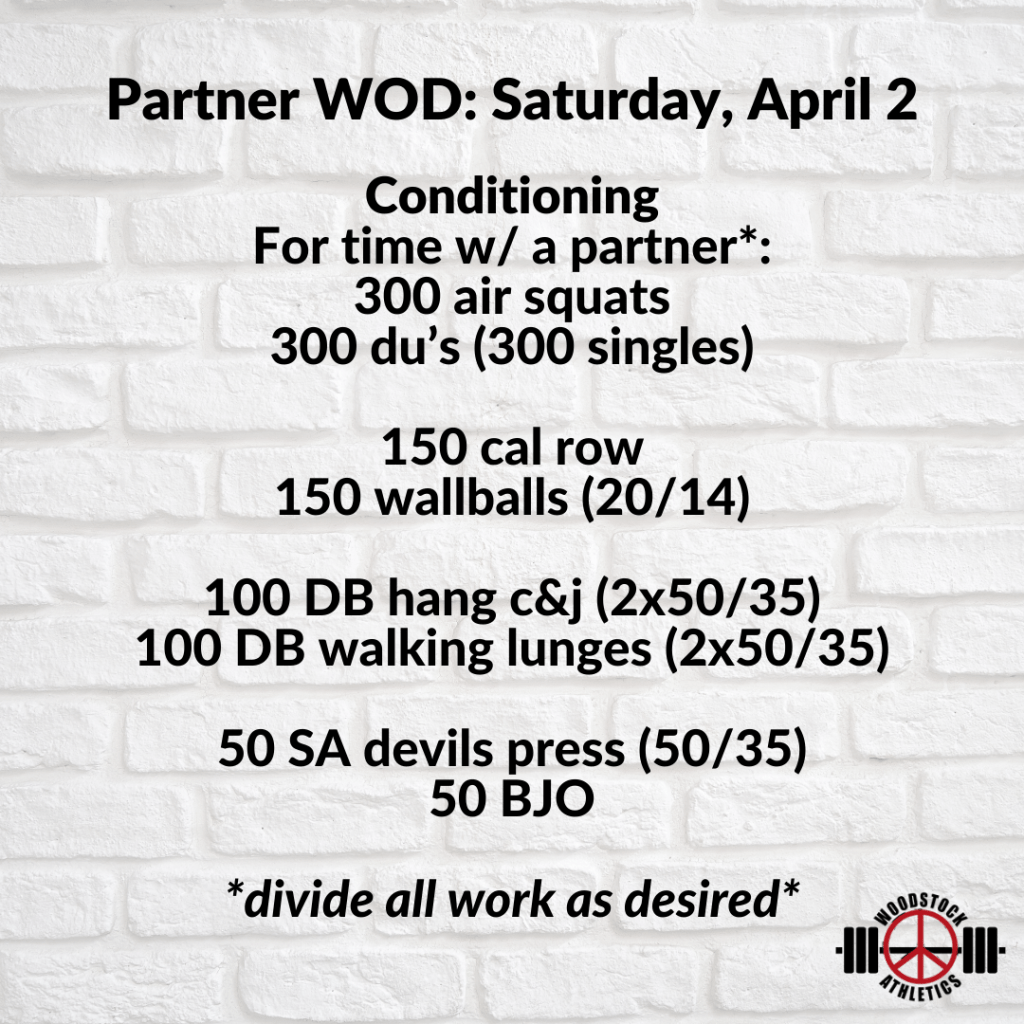 Partner WOD: Saturday, April 2 Posted bySteph VermeychukApril 2, 2022March 27, 2022Posted inWorkout of the Day Share this: Click to share on X (Opens in new window) X Click to share on Facebook (Opens in new window) Facebook Like Loading... Related