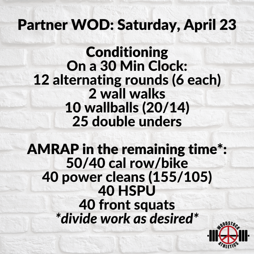 Partner WOD: Saturday, April 23 Posted bySteph VermeychukApril 23, 2022April 17, 2022Posted inWorkout of the Day Share this: Click to share on X (Opens in new window) X Click to share on Facebook (Opens in new window) Facebook Like Loading... Related