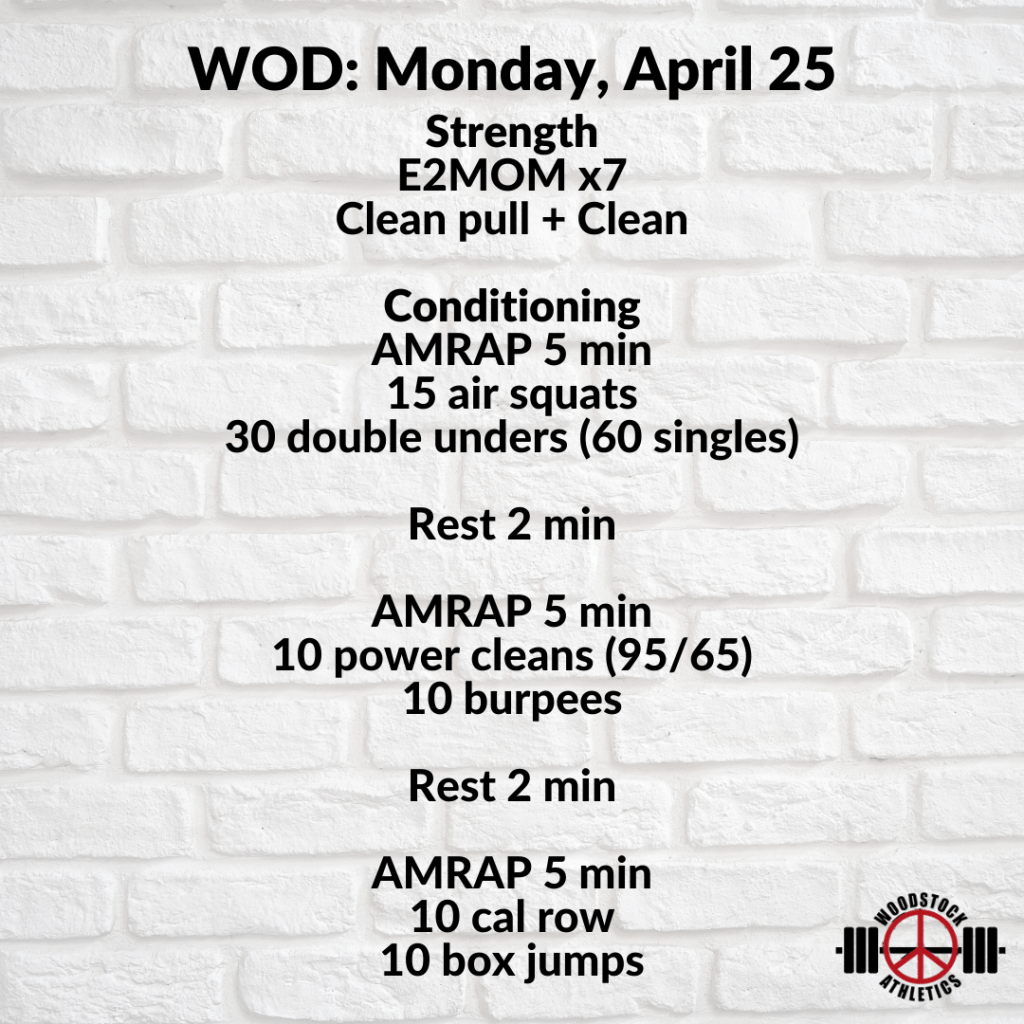 WOD: Monday, April 25 Posted bySteph VermeychukApril 25, 2022April 24, 2022Posted inWorkout of the Day Share this: Click to share on X (Opens in new window) X Click to share on Facebook (Opens in new window) Facebook Like Loading... Related