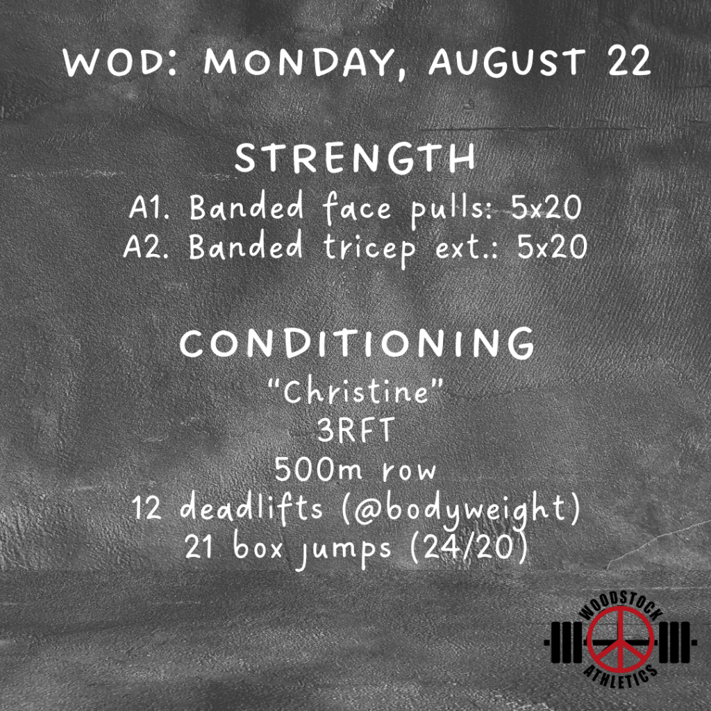 WOD: Monday, August 22 Posted bySteph VermeychukAugust 22, 2022August 22, 2022Posted inWorkout of the Day Share this: Click to share on X (Opens in new window) X Click to share on Facebook (Opens in new window) Facebook Like Loading... Related