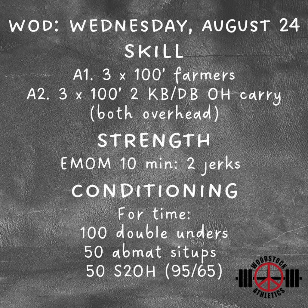 WOD: Wednesday, August 24 Posted bySteph VermeychukAugust 24, 2022August 22, 2022Posted inWorkout of the Day Share this: Click to share on X (Opens in new window) X Click to share on Facebook (Opens in new window) Facebook Like Loading... Related