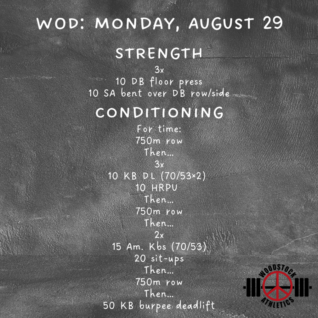 WOD: Monday, August 29 Posted bySteph VermeychukAugust 29, 2022August 28, 2022Posted inWorkout of the Day Share this: Click to share on X (Opens in new window) X Click to share on Facebook (Opens in new window) Facebook Like Loading... Related