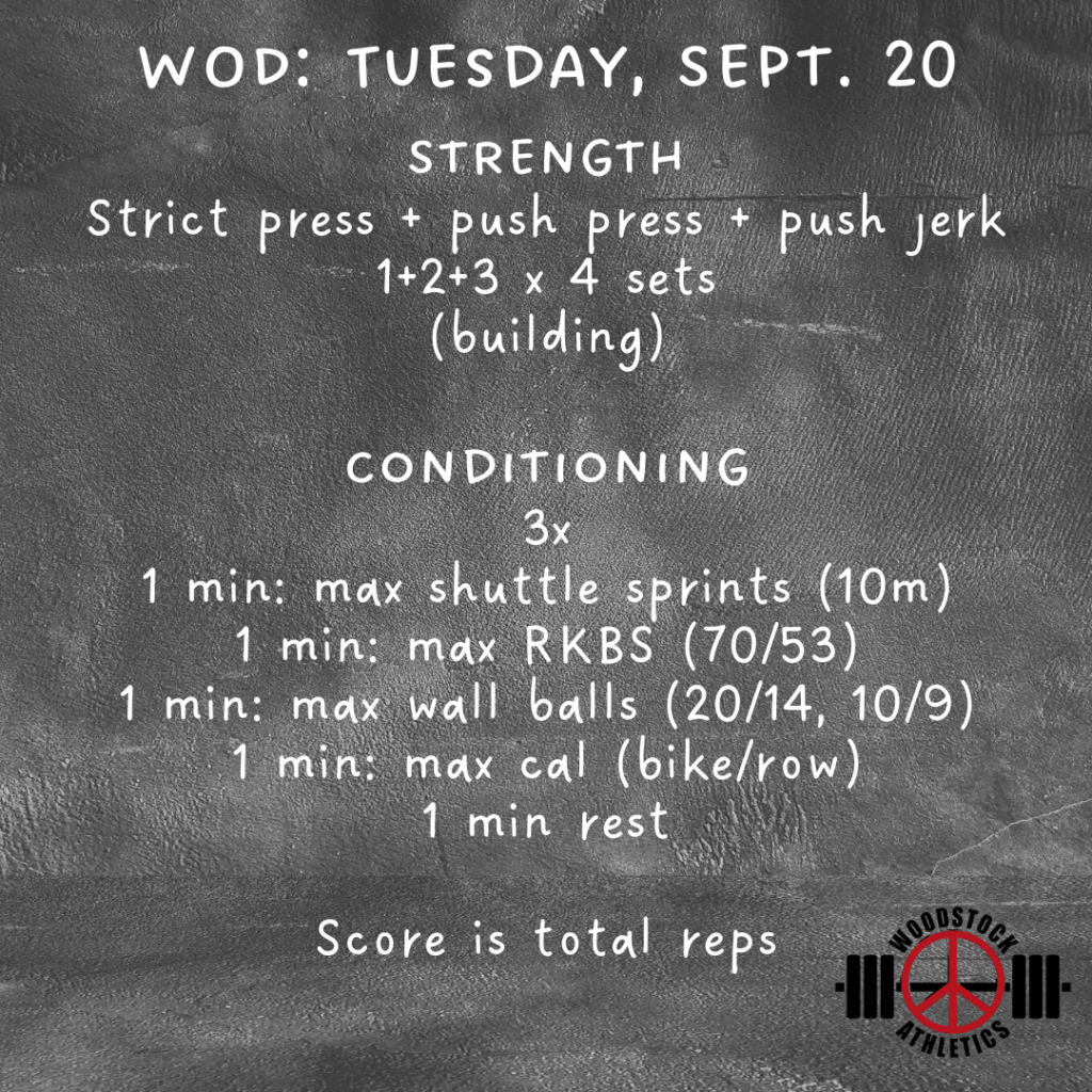 WOD: Tuesday, September 20 Posted bySteph VermeychukSeptember 20, 2022September 18, 2022Posted inUncategorized Share this: Click to share on X (Opens in new window) X Click to share on Facebook (Opens in new window) Facebook Like Loading... Related