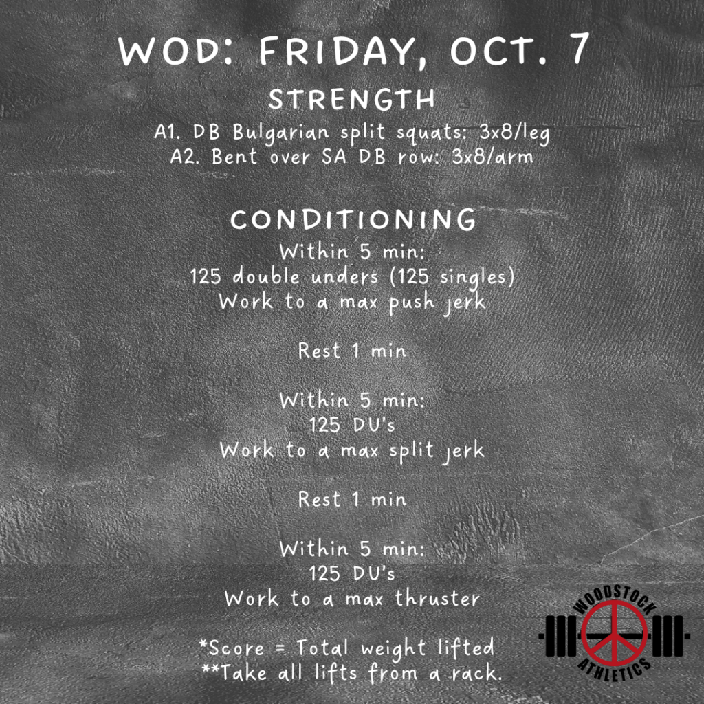 WOD: Friday, October 7 Posted bySteph VermeychukOctober 7, 2022October 2, 2022Posted inWorkout of the Day Share this: Click to share on X (Opens in new window) X Click to share on Facebook (Opens in new window) Facebook Like Loading... Related