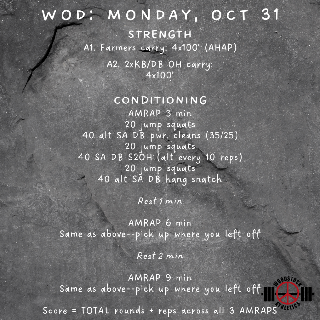 WOD: Monday, October 31 Posted bySteph VermeychukOctober 31, 2022October 30, 2022Posted inWorkout of the Day Share this: Click to share on X (Opens in new window) X Click to share on Facebook (Opens in new window) Facebook Like Loading... Related