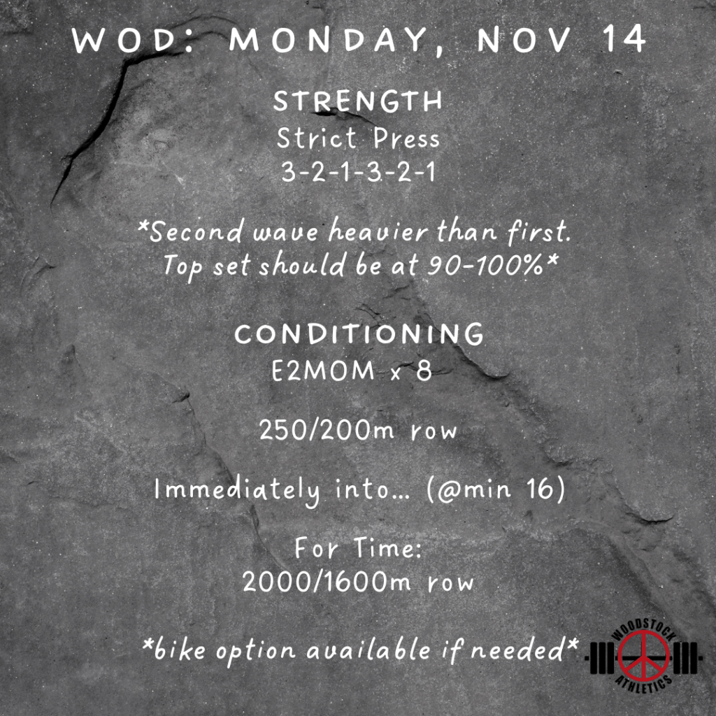 WOD: Monday, November 14 Posted bySteph VermeychukNovember 14, 2022November 6, 2022Posted inWorkout of the Day Share this: Click to share on X (Opens in new window) X Click to share on Facebook (Opens in new window) Facebook Like Loading... Related