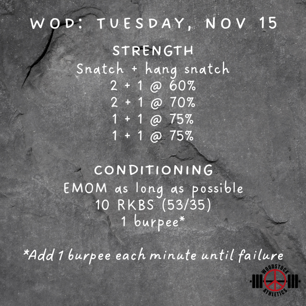 WOD: Tuesday, November 15 Posted bySteph VermeychukNovember 15, 2022November 6, 2022Posted inWorkout of the Day Share this: Click to share on X (Opens in new window) X Click to share on Facebook (Opens in new window) Facebook Like Loading... Related