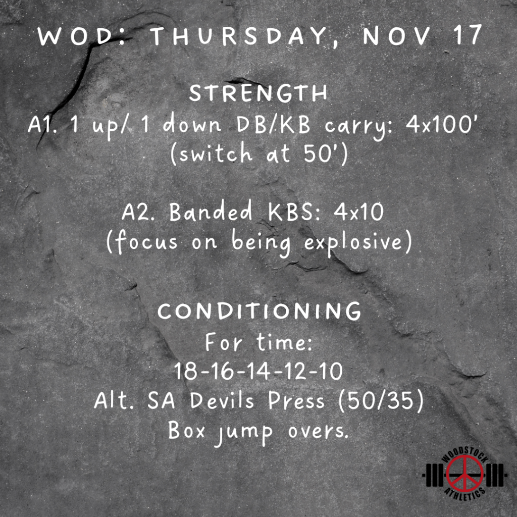 WOD: Thursday, November 17 Posted bySteph VermeychukNovember 17, 2022November 6, 2022Posted inWorkout of the Day Share this: Click to share on X (Opens in new window) X Click to share on Facebook (Opens in new window) Facebook Like Loading... Related