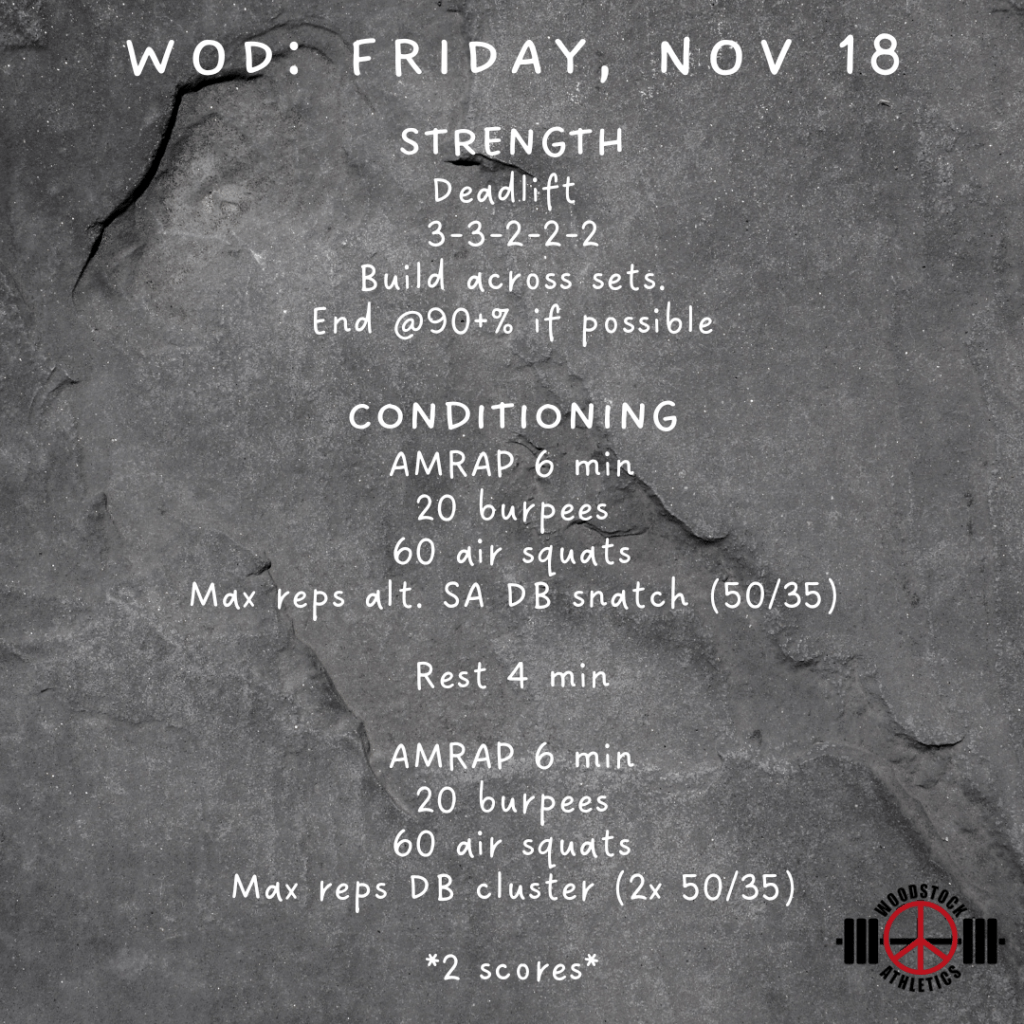 WOD: Friday, November 18 Posted bySteph VermeychukNovember 18, 2022November 6, 2022Posted inWorkout of the Day Share this: Click to share on X (Opens in new window) X Click to share on Facebook (Opens in new window) Facebook Like Loading... Related