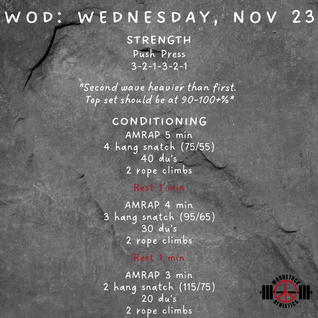 WOD: Wednesday, November 23 Posted bySteph VermeychukNovember 23, 2022November 22, 2022Posted inWorkout of the Day Share this: Click to share on X (Opens in new window) X Click to share on Facebook (Opens in new window) Facebook Like Loading... Related