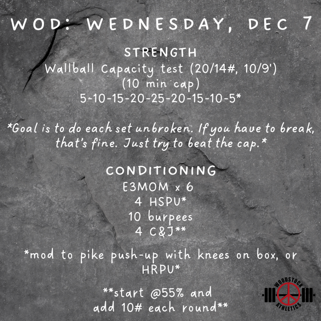 WOD: Wednesday, December 7 Posted bySteph VermeychukDecember 7, 2022December 4, 2022Posted inWorkout of the Day Share this: Click to share on X (Opens in new window) X Click to share on Facebook (Opens in new window) Facebook Like Loading... Related