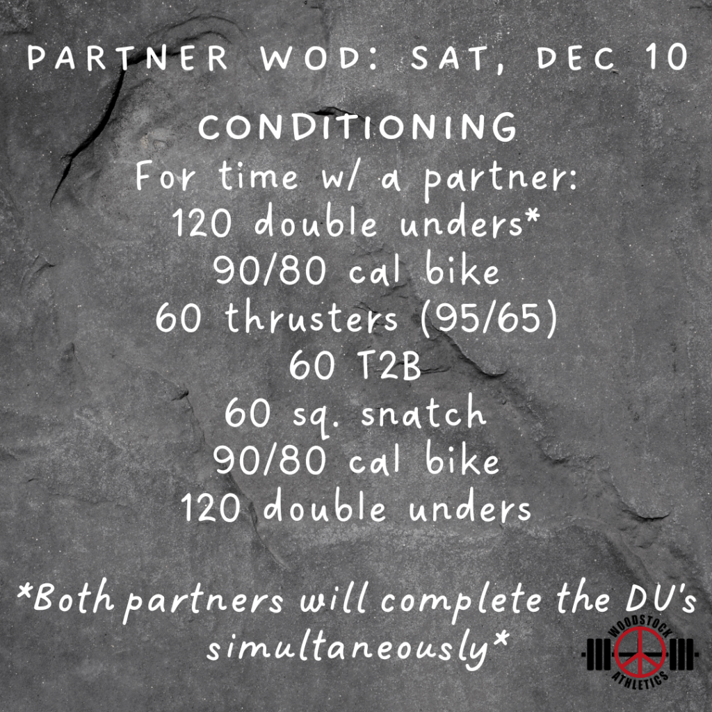 Partner WOD: Saturday, December 10 Posted bySteph VermeychukDecember 10, 2022December 4, 2022Posted inWorkout of the Day Share this: Click to share on X (Opens in new window) X Click to share on Facebook (Opens in new window) Facebook Like Loading... Related