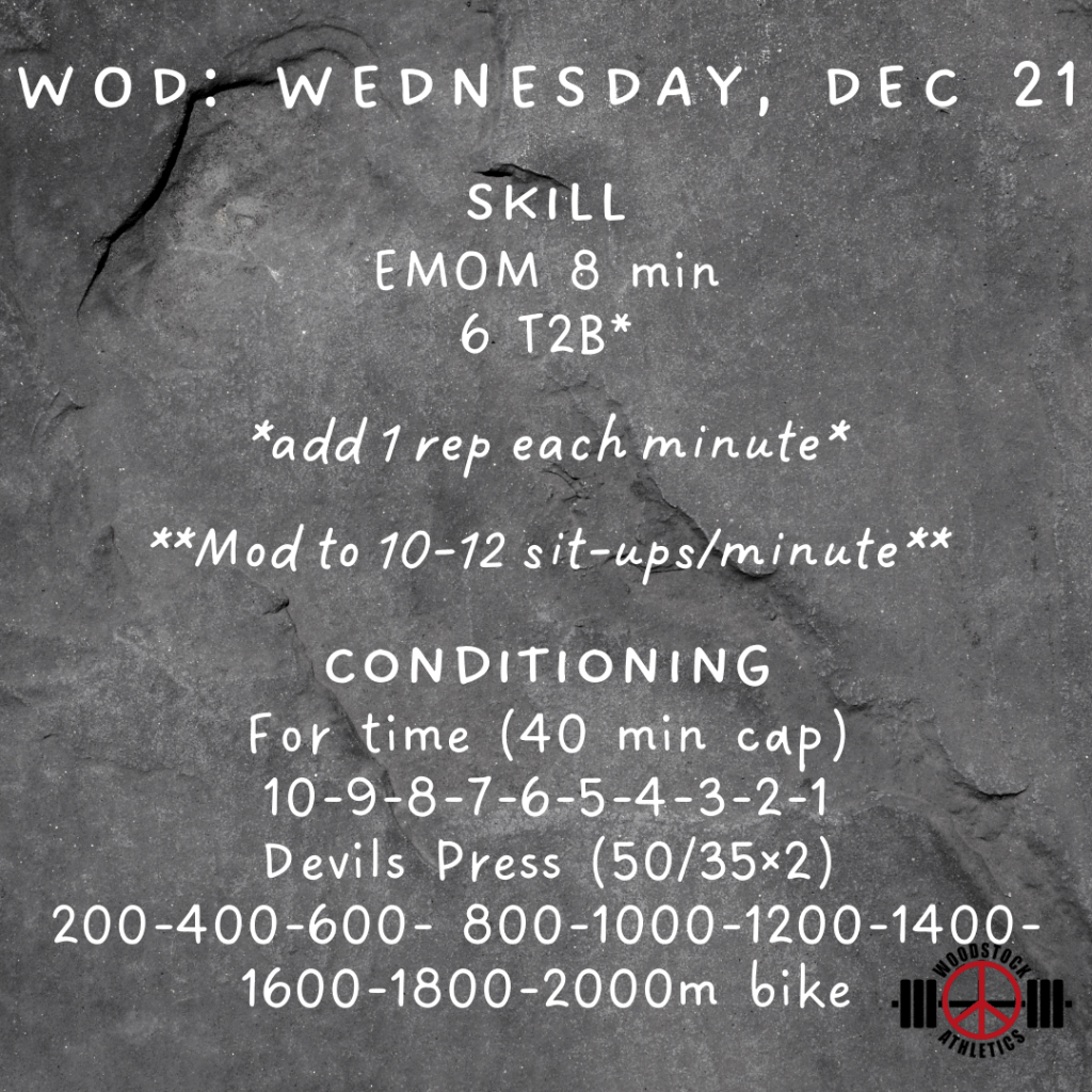 WOD: Wednesday, December 21 Posted bySteph VermeychukDecember 21, 2022December 18, 2022Posted inWorkout of the Day Share this: Click to share on X (Opens in new window) X Click to share on Facebook (Opens in new window) Facebook Like Loading... Related
