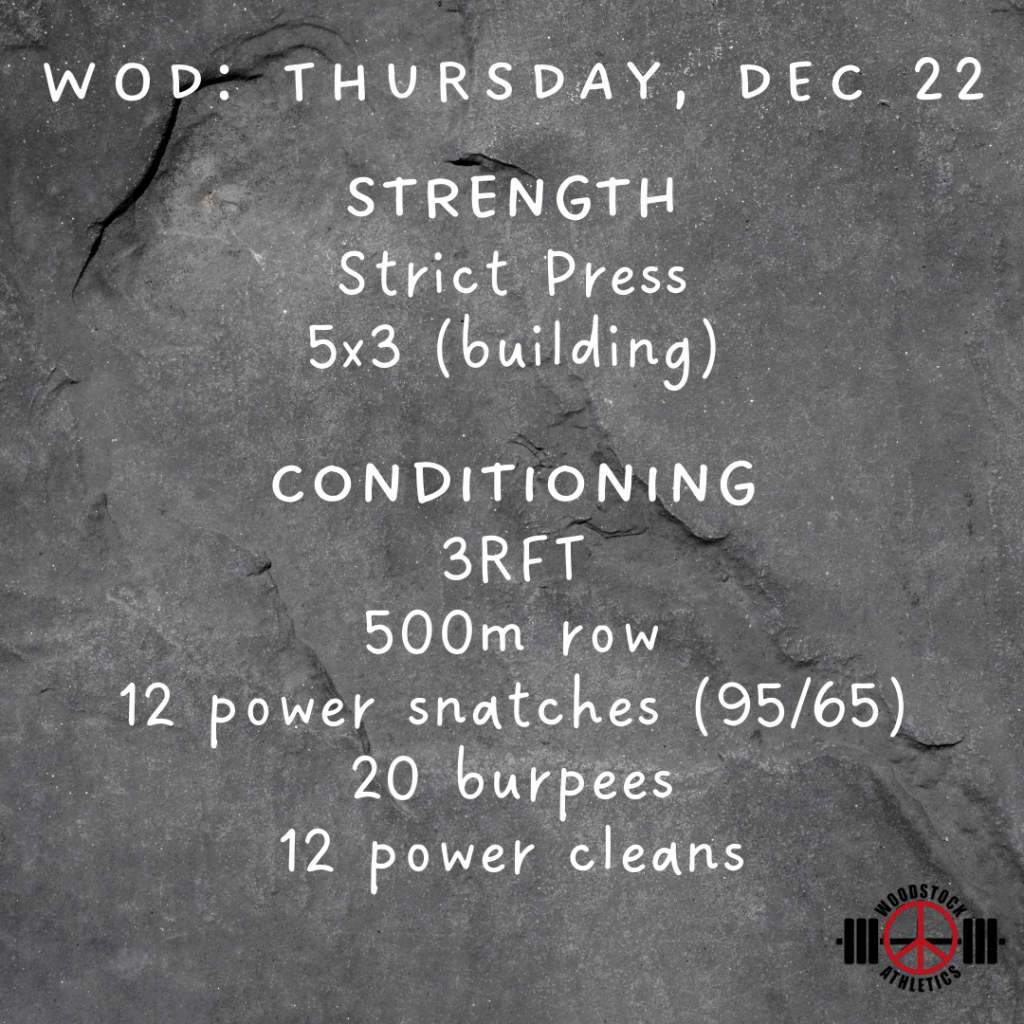 WOD: Thursday, December 22 Posted bySteph VermeychukDecember 22, 2022December 18, 2022Posted inWorkout of the Day Share this: Click to share on X (Opens in new window) X Click to share on Facebook (Opens in new window) Facebook Like Loading... Related