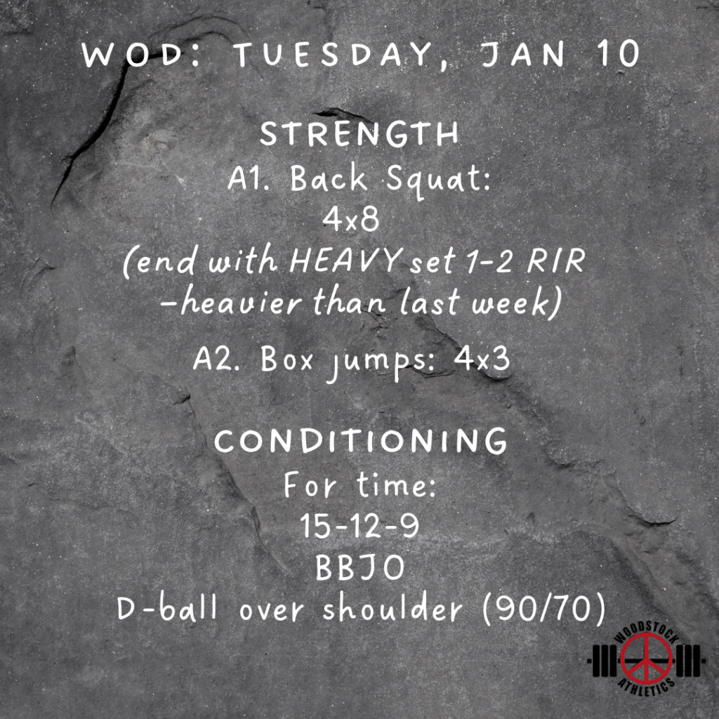 WOD: Tuesday, January 10 Posted bySteph VermeychukJanuary 10, 2023January 8, 2023Posted inWorkout of the Day Share this: Click to share on X (Opens in new window) X Click to share on Facebook (Opens in new window) Facebook Like Loading... Related