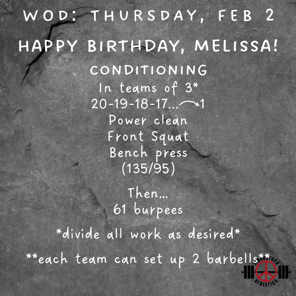 Birthday WOD: Thursday, February 2 Posted bySteph VermeychukFebruary 2, 2023January 29, 2023Posted inWorkout of the Day Happy Birthday, Melissa!!! πͺπΌπͺπΌπͺπΌπͺπΌπͺπΌπͺπΌ Share this: Click to share on X (Opens in new window) X Click to share on Facebook (Opens in new window) Facebook Like Loading... Related