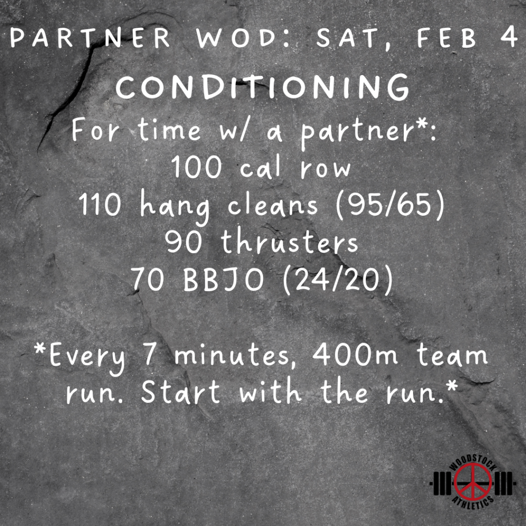 Partner WOD: Saturday, February 4 Posted bySteph VermeychukFebruary 4, 2023January 29, 2023Posted inWorkout of the Day Share this: Click to share on X (Opens in new window) X Click to share on Facebook (Opens in new window) Facebook Like Loading... Related