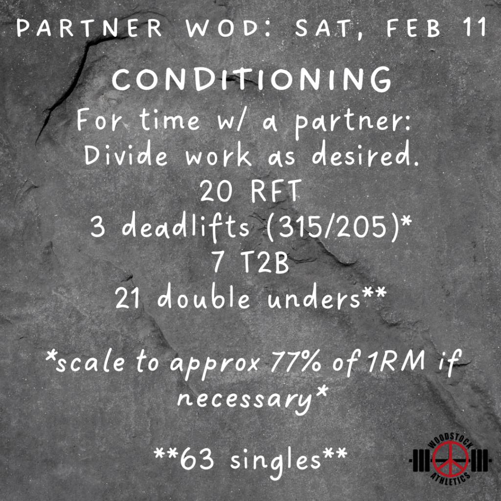 Partner WOD: Saturday, February 11 Posted bySteph VermeychukFebruary 11, 2023February 9, 2023Posted inWorkout of the Day Share this: Click to share on X (Opens in new window) X Click to share on Facebook (Opens in new window) Facebook Like Loading... Related