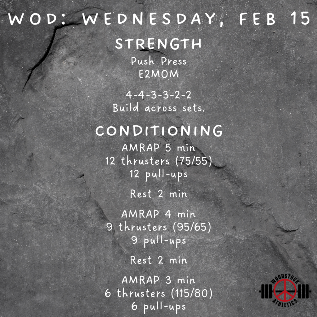 WOD: Wednesday, February 15 Posted bySteph VermeychukFebruary 15, 2023February 12, 2023Posted inWorkout of the Day Share this: Click to share on X (Opens in new window) X Click to share on Facebook (Opens in new window) Facebook Like Loading... Related