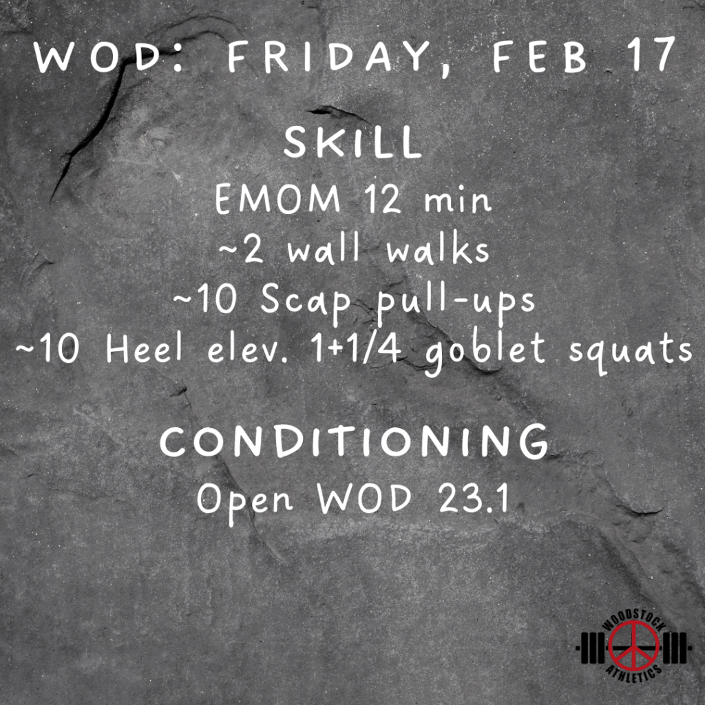 WOD: Friday, February 17 Posted bySteph VermeychukFebruary 17, 2023February 12, 2023Posted inWorkout of the Day Share this: Click to share on X (Opens in new window) X Click to share on Facebook (Opens in new window) Facebook Like Loading... Related