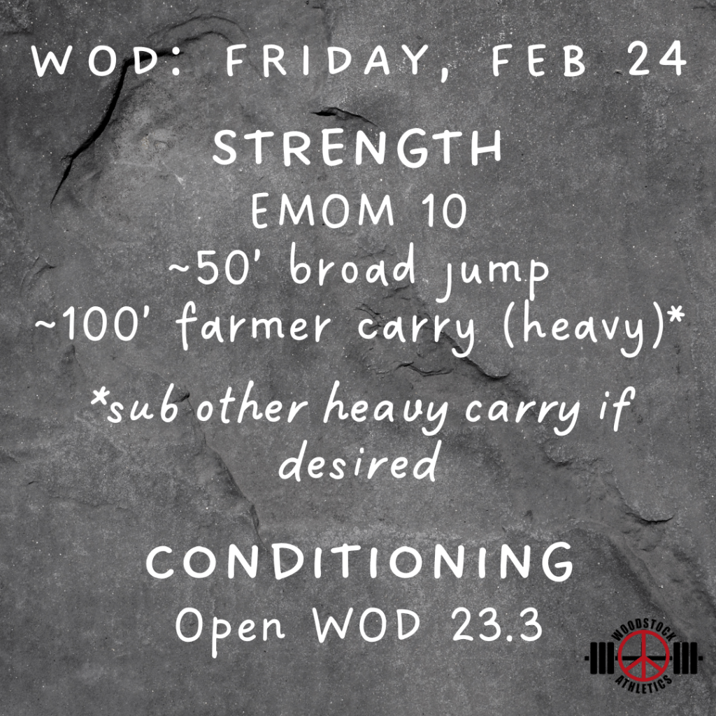 WOD: Friday, February 24 Posted bySteph VermeychukFebruary 24, 2023February 24, 2023Posted inWorkout of the Day Share this: Click to share on X (Opens in new window) X Click to share on Facebook (Opens in new window) Facebook Like Loading... Related
