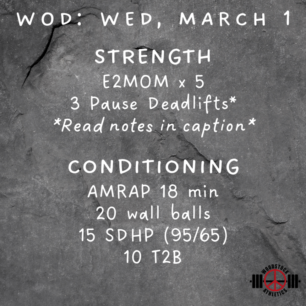 You will pause for 2 seconds just below knee on the way up and lower the bar in a controlled fashion each rep. These will be dead stop reps.