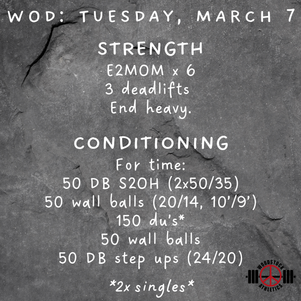WOD: Tuesday, March 7 Posted bySteph VermeychukMarch 7, 2023March 5, 2023Posted inWorkout of the Day Share this: Click to share on X (Opens in new window) X Click to share on Facebook (Opens in new window) Facebook Like Loading... Related
