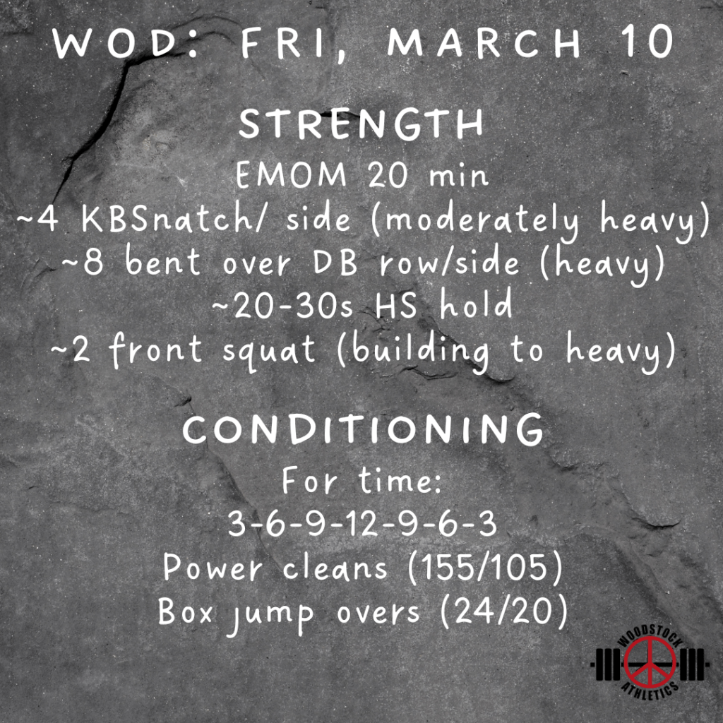 WOD: Friday, March 10 Posted bySteph VermeychukMarch 10, 2023March 5, 2023Posted inWorkout of the Day Share this: Click to share on X (Opens in new window) X Click to share on Facebook (Opens in new window) Facebook Like Loading... Related