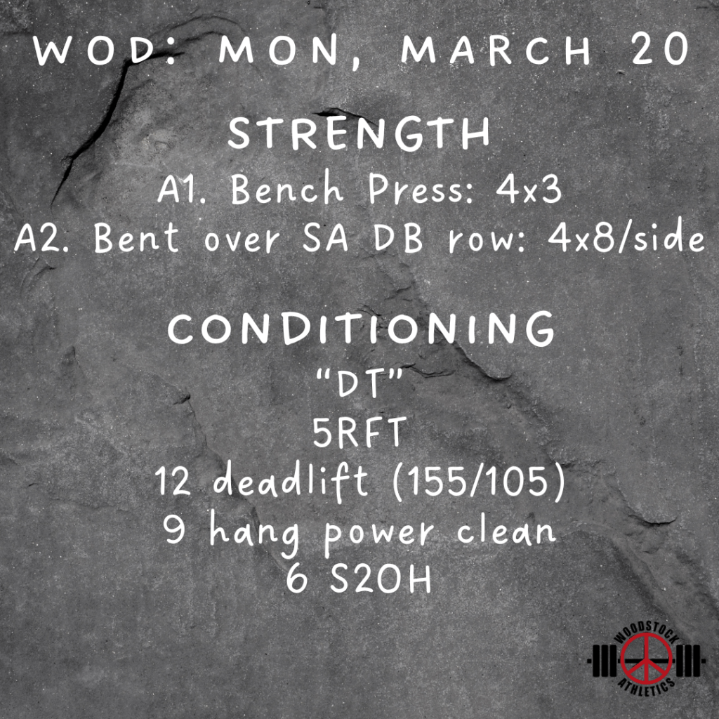 WOD: Monday, March 20 Posted bySteph VermeychukMarch 20, 2023March 19, 2023Posted inWorkout of the Day Share this: Click to share on X (Opens in new window) X Click to share on Facebook (Opens in new window) Facebook Like Loading... Related