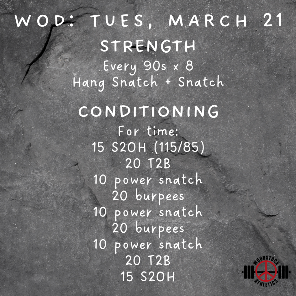 WOD & Barbell Club: Tuesday, March 21 Posted bySteph VermeychukMarch 21, 2023March 19, 2023Posted inWorkout of the Day Share this: Click to share on X (Opens in new window) X Click to share on Facebook (Opens in new window) Facebook Like Loading... Related