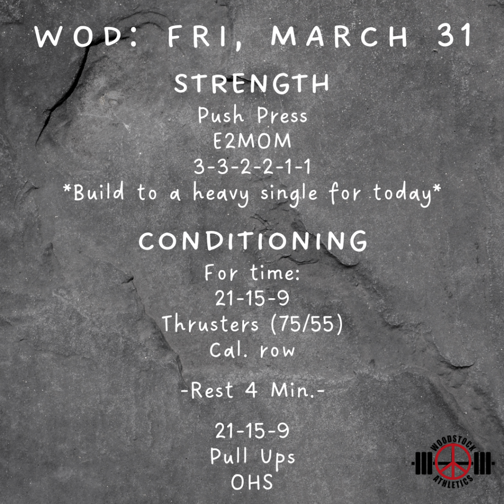 WOD: Friday, March 31 Posted bySteph VermeychukMarch 31, 2023March 26, 2023Posted inWorkout of the Day Share this: Click to share on X (Opens in new window) X Click to share on Facebook (Opens in new window) Facebook Like Loading... Related
