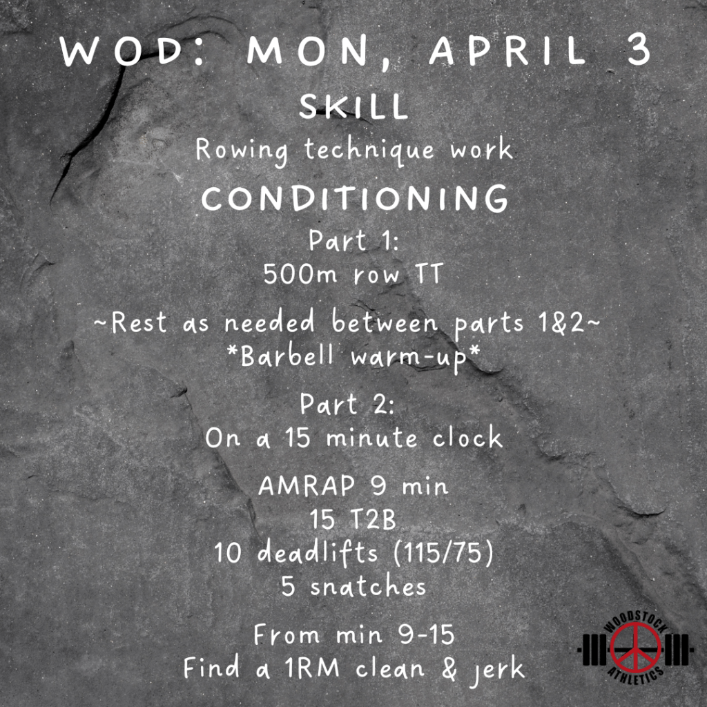 Monday, April 3: WOD & Barbell Club Posted bySteph VermeychukApril 3, 2023April 1, 2023Posted inWorkout of the Day Share this: Click to share on X (Opens in new window) X Click to share on Facebook (Opens in new window) Facebook Like Loading... Related