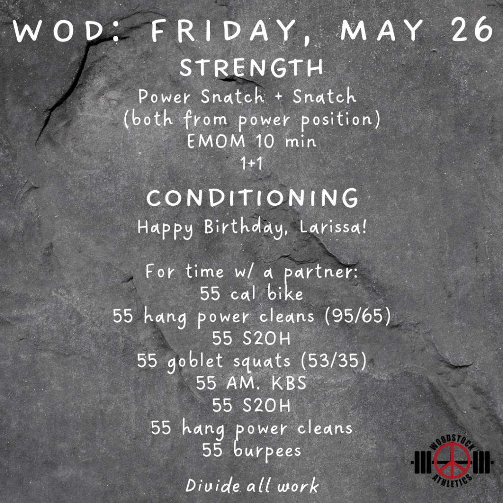 WOD: Friday, May 26 Posted bySteph VermeychukMay 26, 2023May 21, 2023Posted inWorkout of the Day Happy Birthday, Larissa!!! Share this: Click to share on X (Opens in new window) X Click to share on Facebook (Opens in new window) Facebook Like Loading... Related