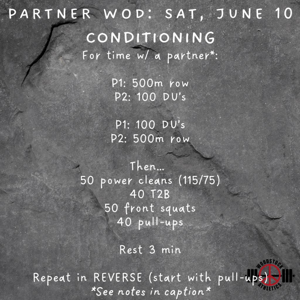 For today’s Partner Workout, the row and DU’s will be completed simultaneously; partners switch once both are done with their work.