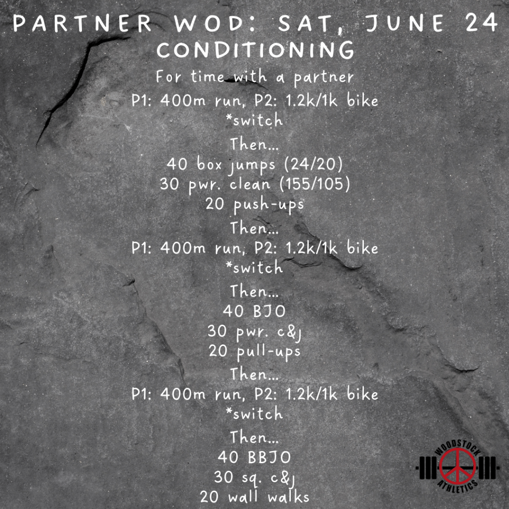 Partner WOD & Barbell Club: Saturday, June 24 Posted bySteph VermeychukJune 24, 2023June 18, 2023Posted inWorkout of the Day Share this: Click to share on X (Opens in new window) X Click to share on Facebook (Opens in new window) Facebook Like Loading... Related