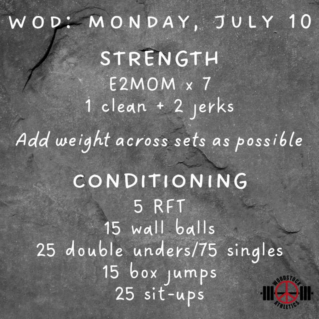 WOD: Monday, July 10 Posted bySteph VermeychukJuly 10, 2023July 9, 2023Posted inWorkout of the Day Share this: Click to share on X (Opens in new window) X Click to share on Facebook (Opens in new window) Facebook Like Loading... Related
