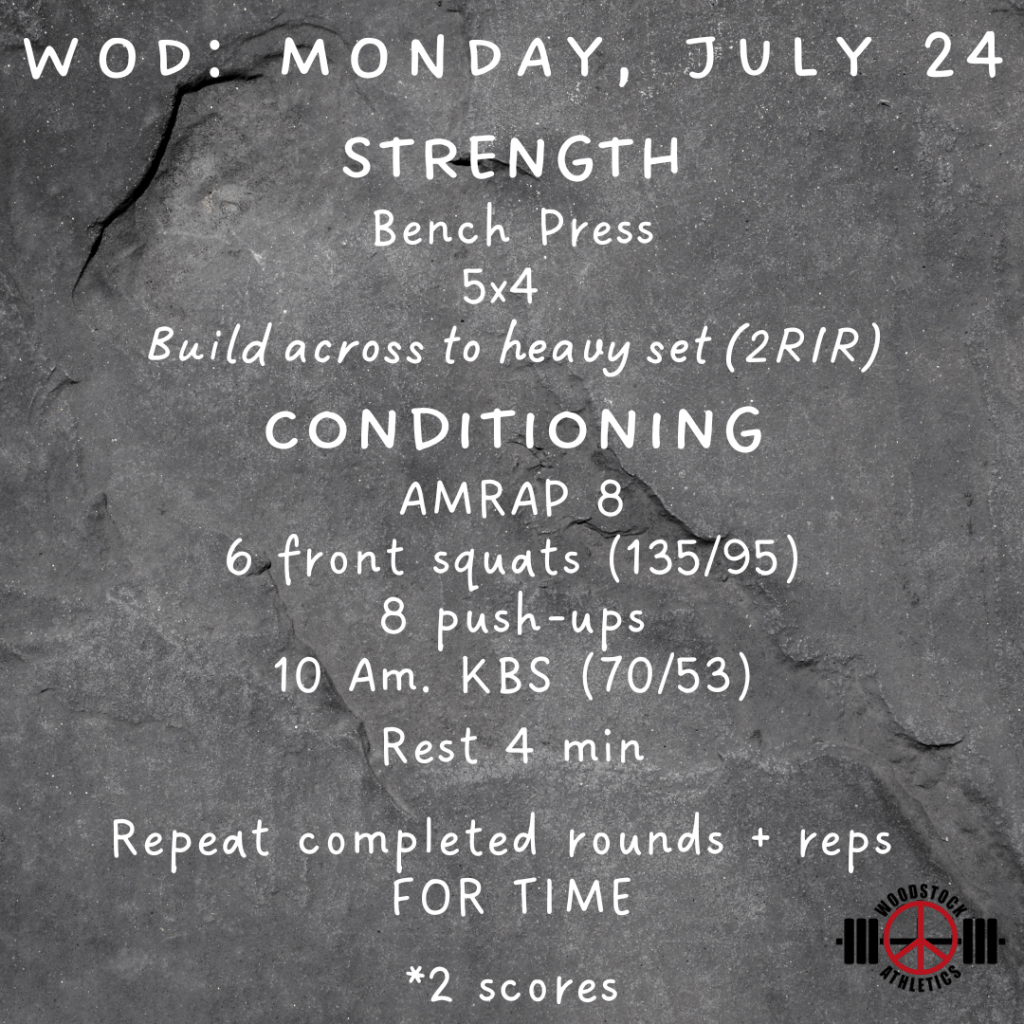 WOD: Monday, July 24 Posted bySteph VermeychukJuly 24, 2023July 22, 2023Posted inWorkout of the Day Share this: Click to share on X (Opens in new window) X Click to share on Facebook (Opens in new window) Facebook Like Loading... Related