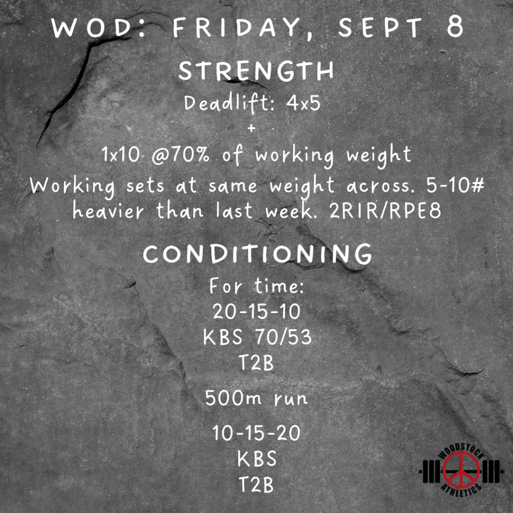 WOD: Friday, September 8 Posted bySteph VermeychukSeptember 8, 2023September 3, 2023Posted inWorkout of the Day Share this: Click to share on X (Opens in new window) X Click to share on Facebook (Opens in new window) Facebook Like Loading... Related